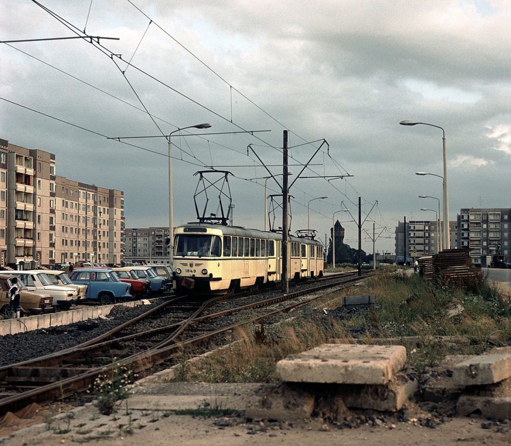 Pendelzug der Linie 6P Straßenbahnhof Paunsdorf–Ahornstraße, gebildet aus drei T4-Triebwagen (Typ 33). Nur der oder die an der Spitze laufenden Wagen mit den Türen auf der rechten Seite können von den Fahrgästen genutzt werden. Das völlige Fehlen von Zweirichtungswagen in Leipzig zwingt zu dieser besonders unökonomischen Betriebsweise. (Mai 1989)
