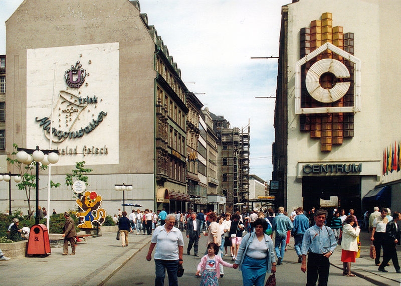 Links zu sehen das Messehaus „Drei Könige“, rechts Centrum-Warenhaus, mit Leuchtreklame an den Giebelwänden.