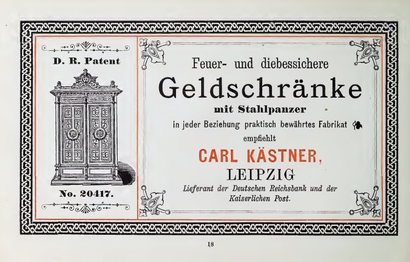 Reklame – Carl Kästner – Geldschränke (1884) Veröffentlicht am 21. November 2018 252teilen twittern merken teilen BewertungReklame – Carl Kästner – Geldschränke (1884)Feuer- und diebessichere Geldschränke mit Stahlpanzer. Lieferant der Deutschen Reichsbank und der kaiserlichen Post.