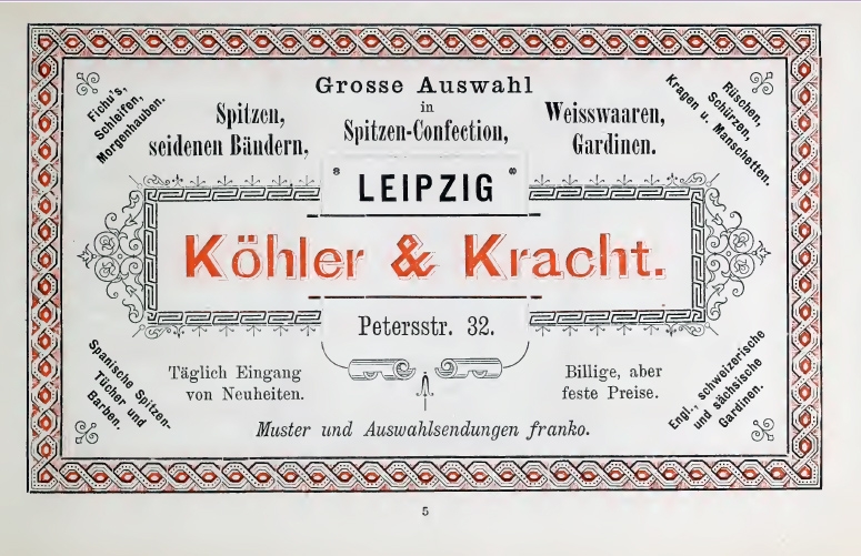 Reklame – Köhler & Kracht, Petersstrasse 32 (1884) Veröffentlicht am 21. November 2018 215teilen twittern merken teilen BewertungReklame – Köhler & Kracht, Petersstrasse 32 (1884)Grosse Auswahl an Spitzen-Confection, Weißwaren, Gardinen
