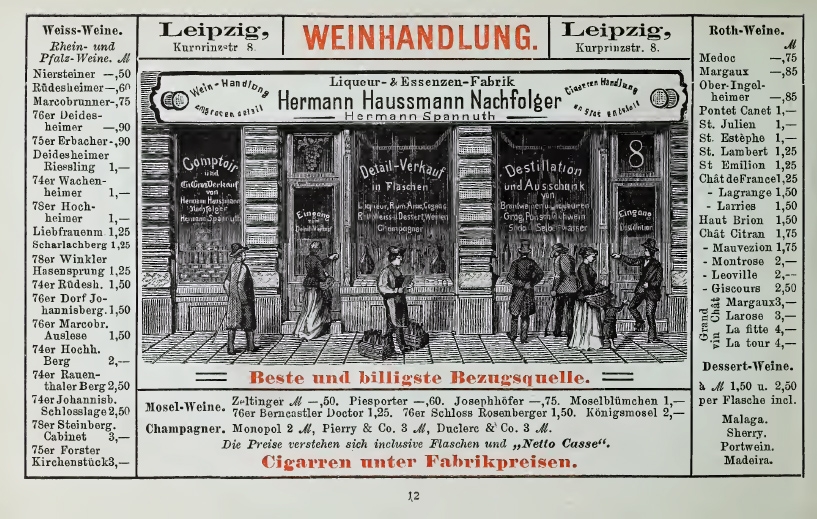 Reklame – Weinhandlung Hermann Haussmann, Kurprinzstrasse 8 (1884) Veröffentlicht am 21. November 2018 223teilen twittern merken teilen BewertungReklame – Weinhandlung Hermann Haussmann, Kurprinzstrasse 8 (1884)Mosel-Weine, Champagner, Cigarren unter Fabrikpreisen