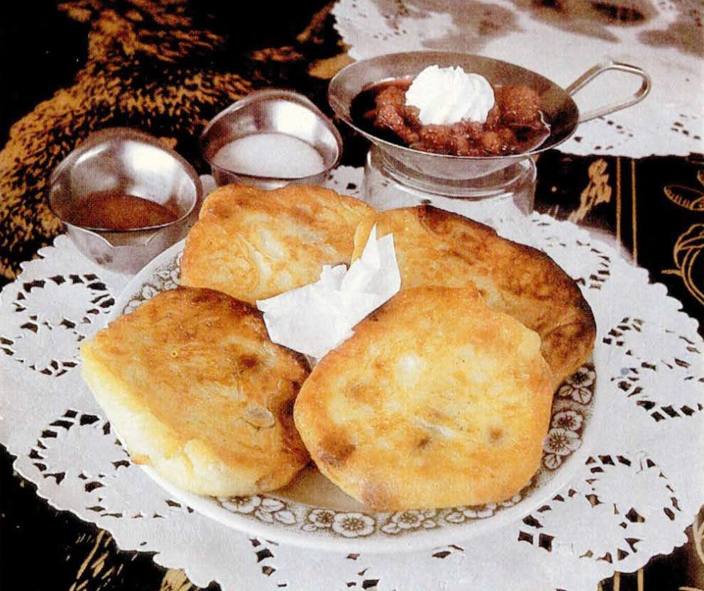 Aus diesem Teig kleine Keulchen formen, in Mehl wälzen und in heißem Fett von beiden Seiten goldgelb braten.