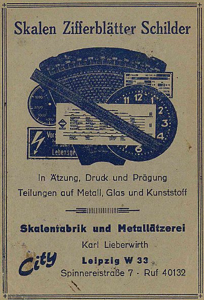 Skalenfabrik u. Metallätzerei Karl Lieberwirth Veröffentlicht am 1. März 2019 248teilen twittern merken 0 teilen Bewertung Skalenfabrik u. Metallätzerei Karl Lieberwirth, Leipzig W 33, Spinnereistr. 7