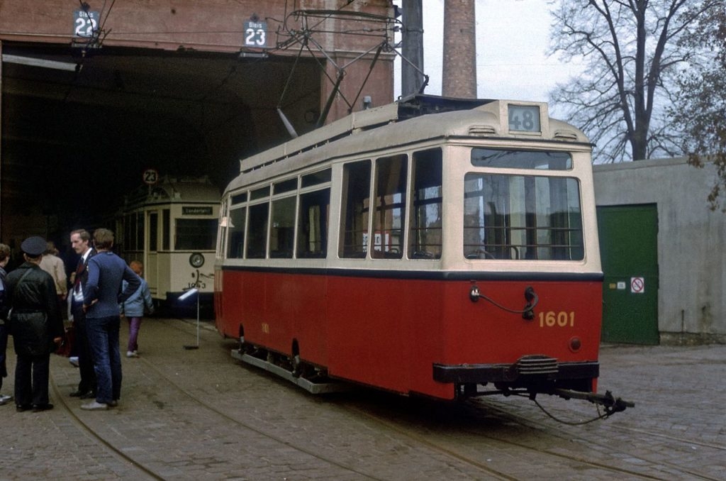 Typ 30, Prototyp der »Lowa-Wagen«. Nur die Wagen für Leipzig wurden als Einrichtungswagen mit Busbestuhlung und ohne Winschutzwände gebaut. Die Prototypen erhielten robuste Bodenrahmen aus Walzträgern, das Problem des durchgebogenen Wagenkastens trat bei ihnen nicht auf. B-Ende, der Zielschildkasten ist hier nur ein Fenster. ESW-Kupplungen mit Klavier gab es noch nicht, die herausgeführte Leitung ist der Bremsanschluss für die Beiwagen, die Dose darunter der Lichtanschluss.
